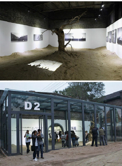 鐘維興的《失落園》在布展區(qū)準(zhǔn)備充分,展場(chǎng)復(fù)原了沙漠胡楊景觀(guān),加上投影,錄像,以及收藏級(jí)制作展覽圖片,在展場(chǎng)設(shè)計(jì)的每一個(gè)細(xì)節(jié)上都堪稱(chēng)完美,這是讓我印象最為深刻的。在拍攝方式上也很有新意及突破,沙漠,胡楊,人體,同時(shí)邀請(qǐng)當(dāng)?shù)剞r(nóng)民來(lái)更加突顯出了攝影作品的主題。歐陽(yáng)星凱的《人民路》拍攝者非常大膽的用了魚(yú)眼拍攝人物,在平時(shí)拍攝中我們忌諱用魚(yú)眼記錄風(fēng)景及人文上,作者用魚(yú)眼的攝影方式記錄農(nóng)民工的工作和生活環(huán)境。