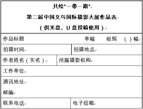 投稿作品以光盤(CD-R或DVD-R)、U盤存儲形式郵寄至:北京市東城區(qū)東四十二條48號中國攝影報社活動部 “第二屆中國義烏國際攝影大展”辦公室收(100007)