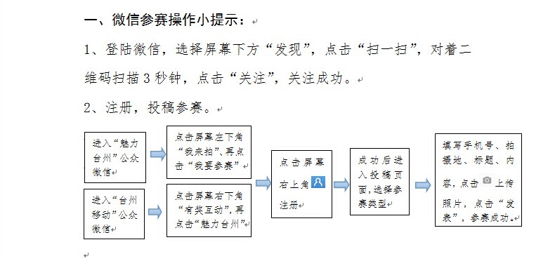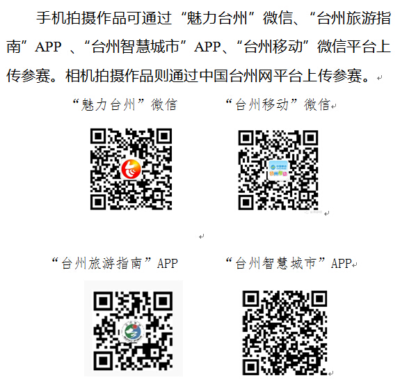 1、上傳作品。手機(jī)拍攝作品可通過“魅力臺州”微信、“臺州移動”微信、“臺州旅游指南”APP 、“臺州智慧城市”APP等平臺上傳參賽。相機(jī)拍攝作品則通過中國臺州網(wǎng)平臺上傳參賽。