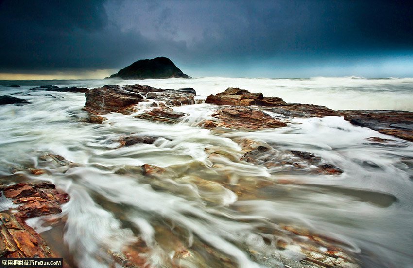 這張是臺(tái)風(fēng)陰雨天的浪花拉絲,這樣的場(chǎng)景中,天海間的光比基本均衡,所以可以不用GND,但要讓浪花拉絲,快門要保持在1秒,而現(xiàn)場(chǎng)光曝光組合是:F14、1/8、iso 100,加個(gè)ND8,減少三擋光,快門正好是1秒。