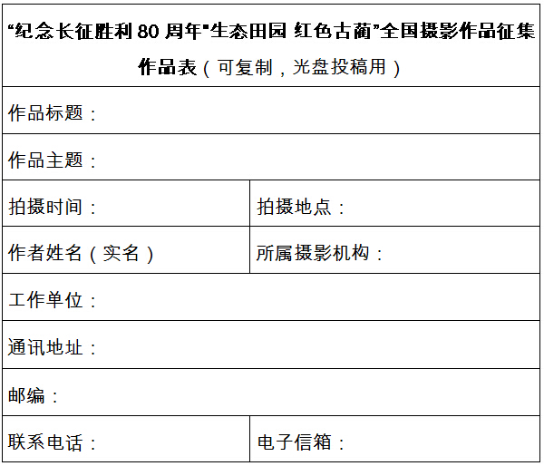 北京市東城區(qū)東四十二條48號中國攝影報社活動部2016“紀(jì)念長征勝利80周年”“生態(tài)田園 紅色古藺”全國攝影作品征集辦公室收(100007),電話:010—65251661,聯(lián)系人:夏雨欣。