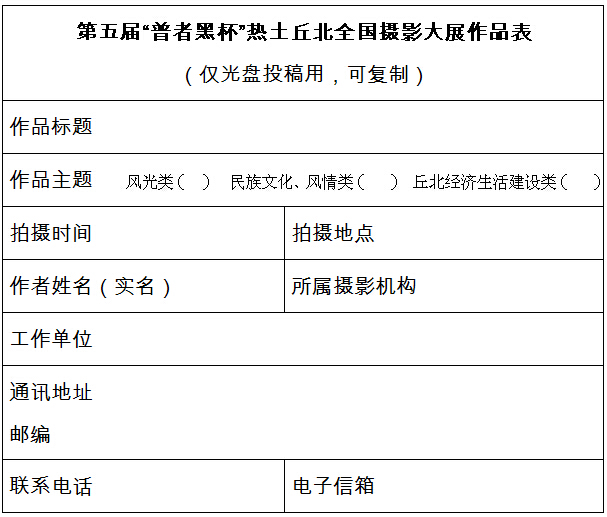 北京市東城區(qū)東四十二條48號(hào)中國(guó)攝影報(bào)社活動(dòng)部“五屆普者黑全國(guó)攝影大展”辦公室收(100007)