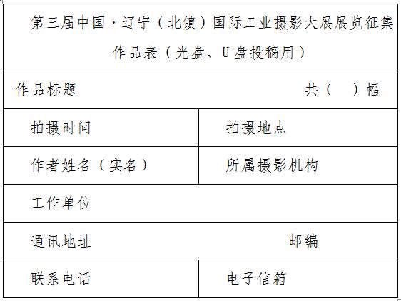 光盤、U盤包裝盒上注明該展名稱,每幅作品文件名處注明作品標題,同時提供作者資料及作品信息(word文檔)。投稿作品為JPG格式,圖片統(tǒng)一處理為長邊600-1000像素,文件大小控制在500KB以內。無相關資料的投稿作品,主辦單位有權取消其參評資格。投稿作品以光盤(CD-R或DVD-R)、U盤存儲形式郵寄至:北京市東城區(qū)東四十二條48號中國攝影報社 第三屆中國·遼寧(北鎮(zhèn))國際工業(yè)攝影大展辦公室收(100007)