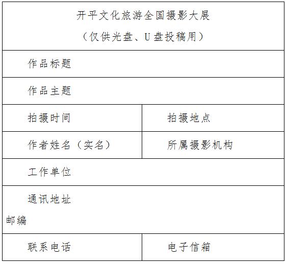 投稿作品以光盤(CD-R或DVD-R)、U盤存儲形式郵寄至:北京市東城區(qū)東四十二條48號中國攝影報社 開平文化旅游全國攝影大展辦公室收(100007)
