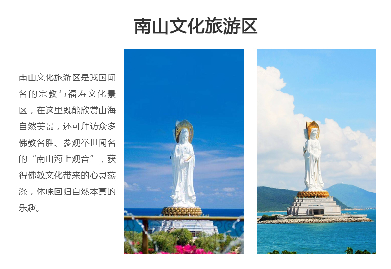 游覽集熱帶園林、佛教文化為一體的“福澤之地”、國家5A級景區(qū)—【南山文化旅游區(qū)】含景區(qū)用餐時間不少于120分鐘,觀南海奇觀--海上108米觀音圣像,觀音島平臺祈愿,福隨心動;國家5A級景區(qū)【蜈支洲島】:(含往返船費,含上下島不少于180分鐘)“中國的馬爾代夫”--島上的海盜吧旁的淡水泳池是《私人定制》的“主要取景地”,這里一彎碧池掩映于藍天、椰林之間,池邊形似于“鳥巢”的白色建筑構(gòu)筑于海天之間,在三角梅、藍天、碧池、椰影婆娑的映襯之下,顯得格外的清幽與恬淡,在這里不妨?xí)駮裉枺荡岛oL(fēng),找找感覺!【夜游三亞灣】:(贈送項目,不用費用不退,時間不少于60分鐘)三亞是個不夜城,美麗的三亞灣是三亞最美的濱海海岸線,奢華的鳳凰島是三亞的標志性景觀,夜幕降臨時,海風(fēng)微微吹起,濤聲不斷敲打著海岸,夜空中最亮的星星,燈火輝煌的椰夢長廊,乘著游輪開始神奇、浪漫、刺激的海上之旅。啤酒免費暢飲、體驗人在船上、船在海中央的美麗海灣夜景。