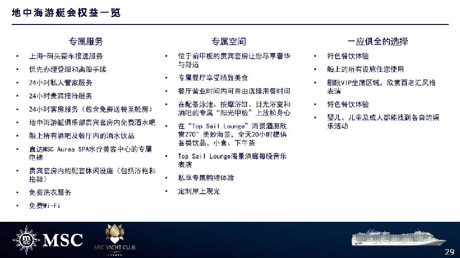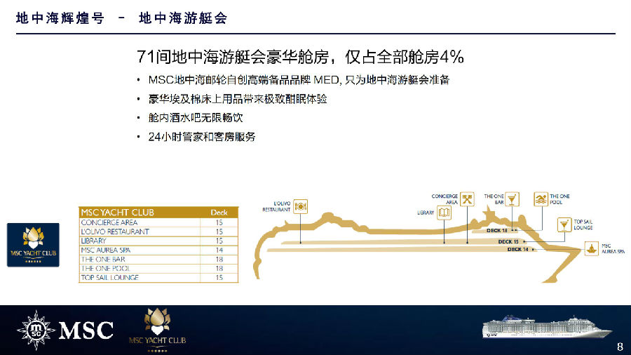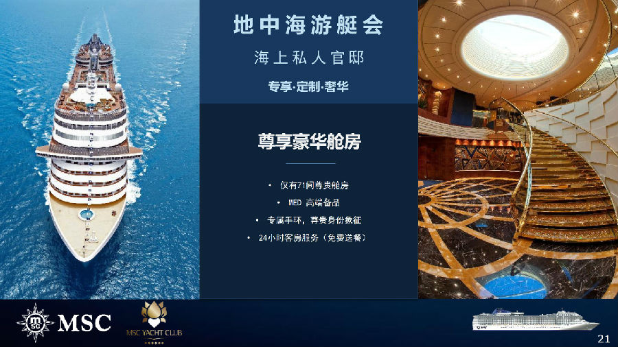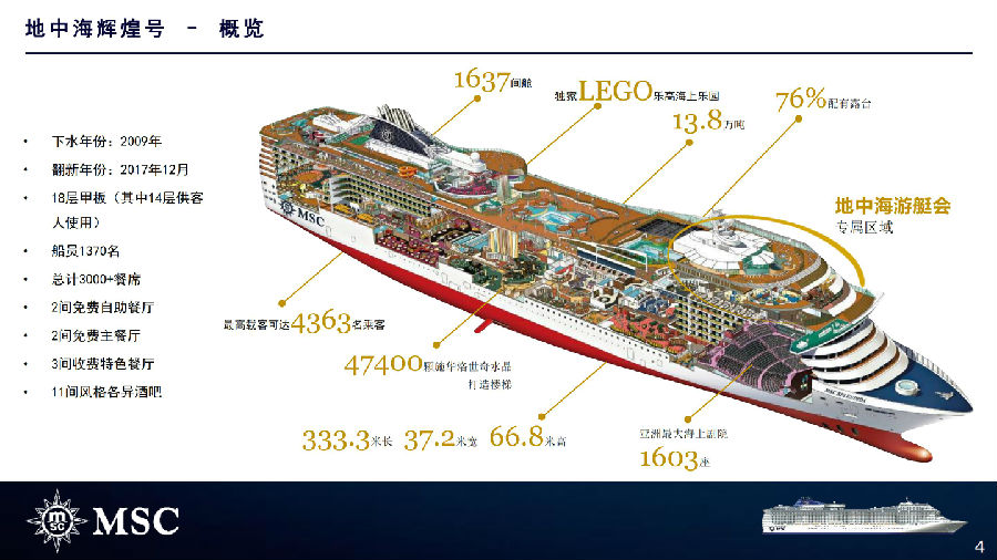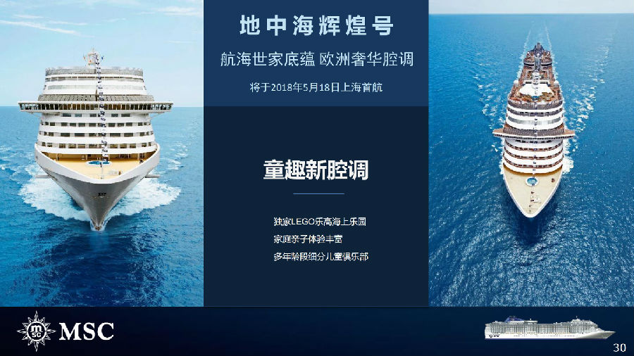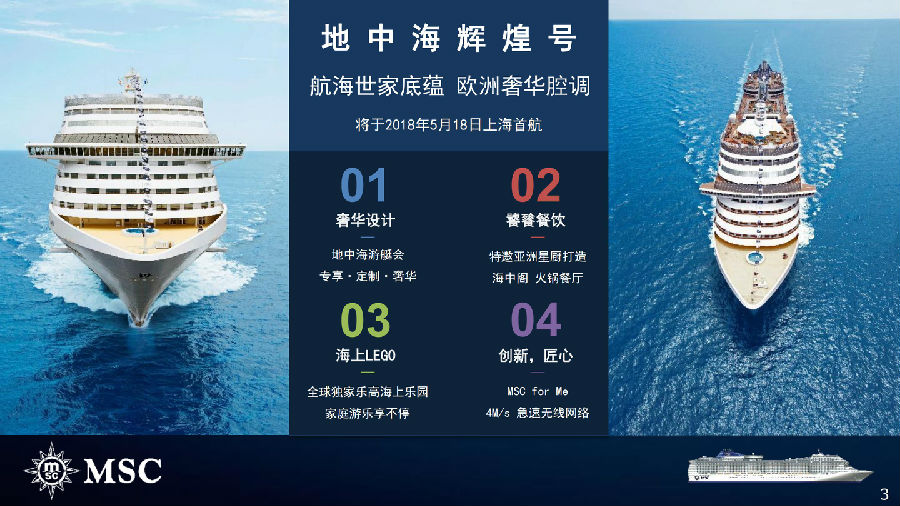 MSC Splendida 地中海輝煌號作為地中海郵輪旗艦幻想曲級中奪目的一員,融合了現代高科技和體驗舒適度,為中國賓客奉上純正歐洲品質體驗。繼2018年成功營運之后,2019年6月5日地中海輝煌號再度從中國出發(fā),推出多個母港出發(fā)的航線,包括:上海、天津、廈門與深圳,跨越2019-2020年的52個航次,為更多中國賓客帶來超乎想象的純正歐洲品質。