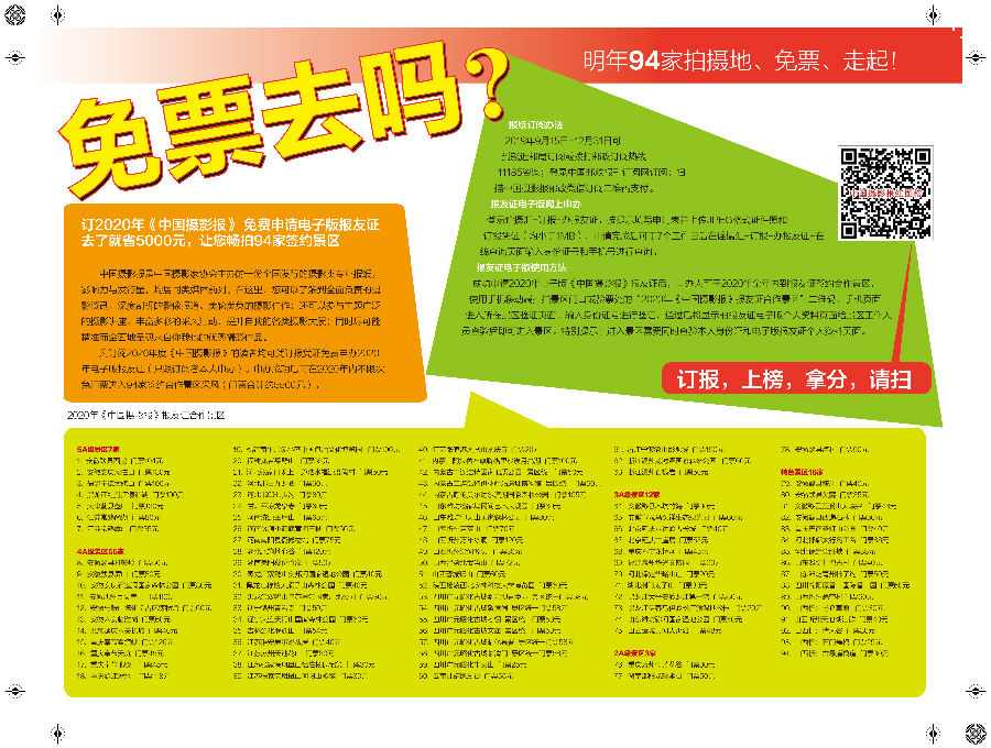 凡訂閱2020年度《中國攝影報》的讀者均可憑訂報憑證申辦2020年電子版《中國攝影報》報友證(只限訂閱者本人申辦)。申辦成功后可在2020年內(nèi)不限次免門票進入94家簽約合作景區(qū)采風(門票合計約5500元)。