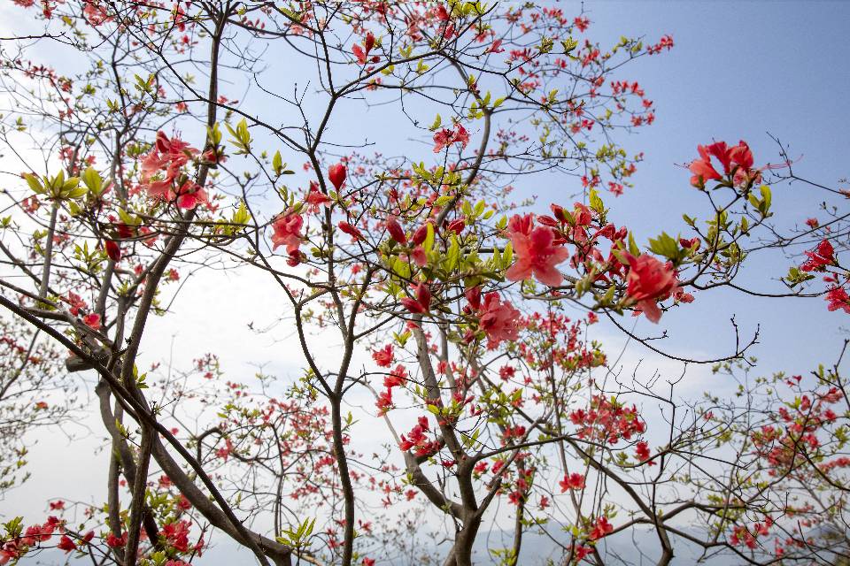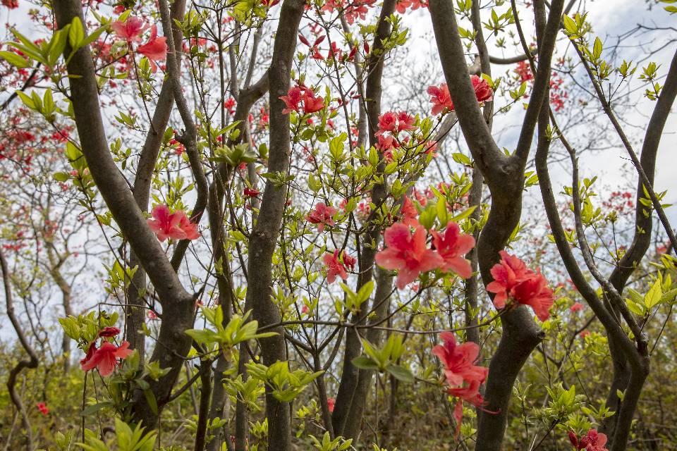 三門稻蓬山有1000多畝野生高山杜鵑,樹齡逾百年,高三四米,品種多達(dá)五六種,遠(yuǎn)遠(yuǎn)望去紅、紫、粉、白把整個山坡裝扮得絢麗多彩,如云似錦,分外妖嬈。