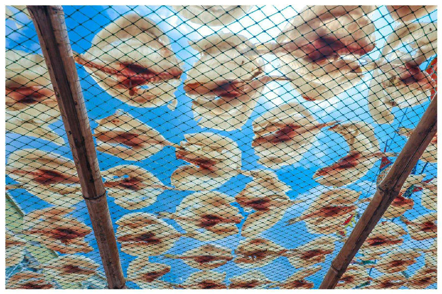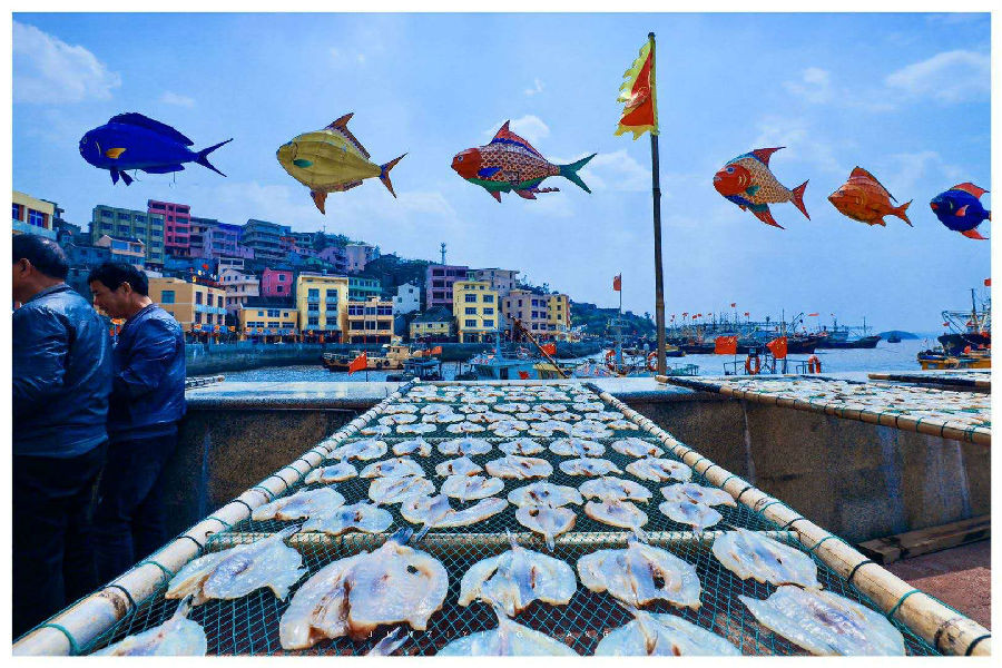 不僅碼頭欄桿的一排排曬魚架上,鋪滿了正在晾曬的鰻魚,走在巷弄間,屋與屋的縫隙之間拉了許多繩子,晾曬著各種魚鲞,成了一道亮麗的風(fēng)景線。