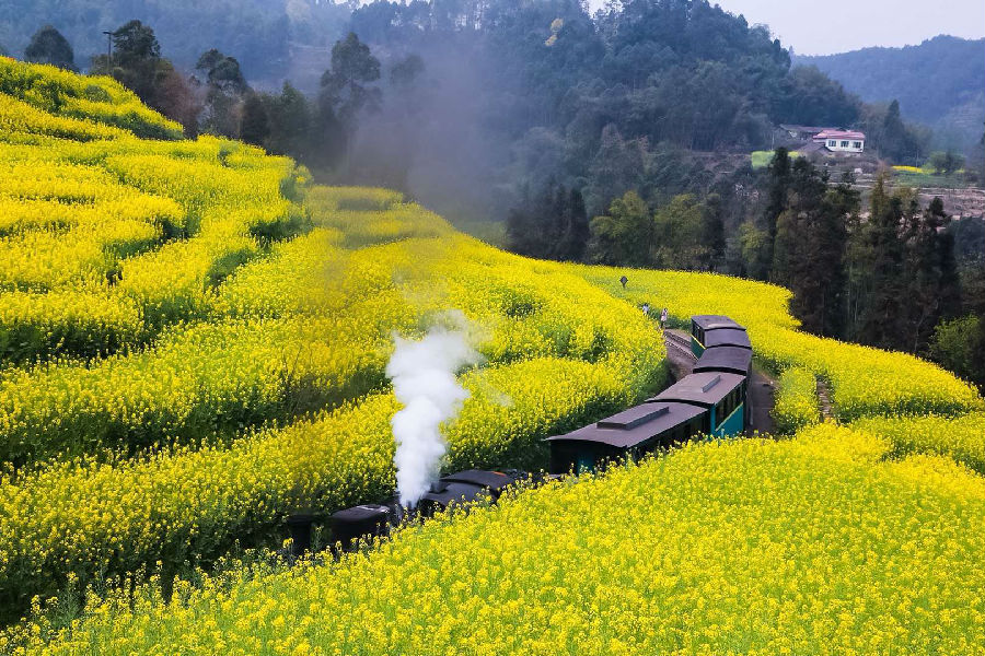 早出發(fā),經成雅高速抵達犍為,拍攝全球獨版的嘉陽蒸汽小火車穿行于盛開著金黃油菜花的山間和原野,后抵達黃村站后,稍作休息,繼續(xù)乘車返程。