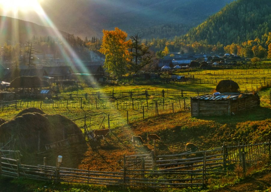 早拍寧靜的山村靜謐、祥和,溫暖升起裊裊炊煙,彌漫了村莊,構(gòu)成了一幅天然美景,就像走進了一個人間天堂、童話世界。午餐后乘車赴布爾津赴五彩灘,等待夕陽西下的五彩灘。晚上入住布爾津縣。