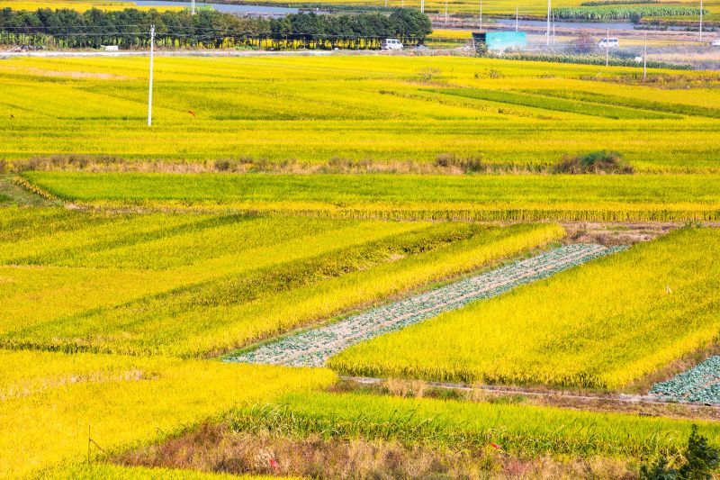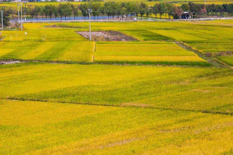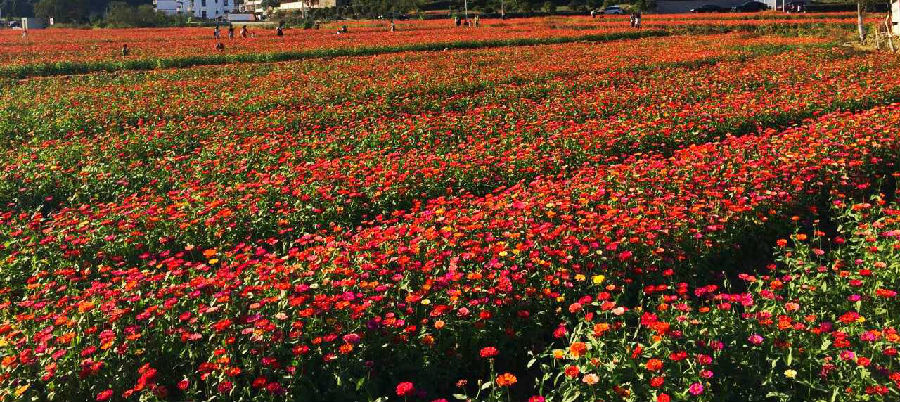 站在山間遠(yuǎn)眺,一大片姹紫嫣紅的花田,紅白粉紫、瓊英萬(wàn)點(diǎn),襯上碧綠的葉子,仿佛在大地上鋪設(shè)了一匹流光溢彩的錦緞。